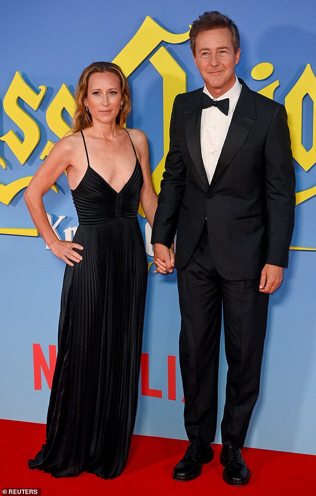 Dapper Dan: Edward Norton, de 50 años, se unió a su esposa Shauna Robertson, de 46, en el estreno de Glass Onion: A Knives Out Mystery en Londres el domingo.