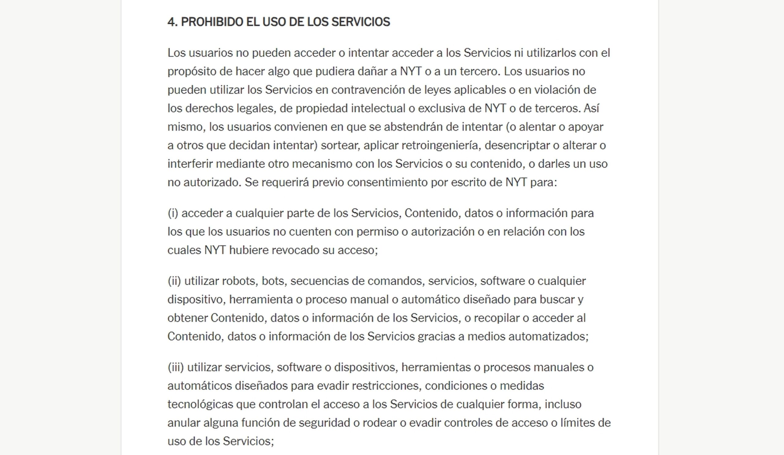 The New York Times es uno de los primeros en intensificar y prohibir explícitamente en sus Términos de servicio el uso de su contenido para entrenar herramientas basadas en IA.