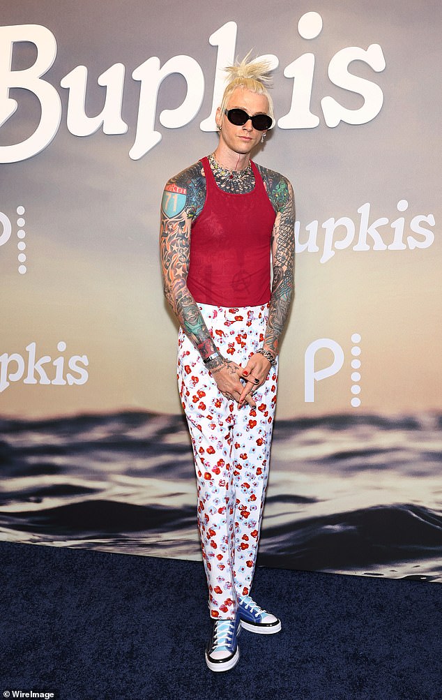 Nervioso: MGK (nacido como Colson Baker), que nunca se avergonzó de los conjuntos coloridos, salió con pantalones blancos adornados con rosas rojas y blancas y una camiseta sin mangas roja ceñida.