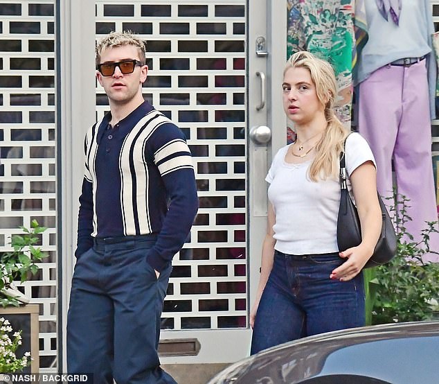 Casual: The It’s A Sin star, 24, perhaps inspired by Britpop singer Noel, rocked a vintage long sleeve sweatshirt with a pinstripe pattern