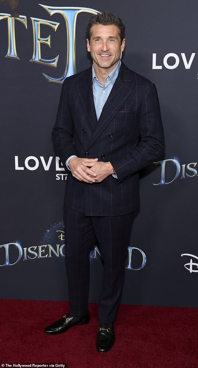 Conjunto de alfombra roja: Patrick Dempsey, de 56 años, mostró su sentido de la moda con un traje negro a rayas, una camisa de vestir azul claro y zapatos de vestir negros cuando asistió al estreno de Disney’s Disenchanted en el Teatro El Capitán en Los Ángeles el miércoles.