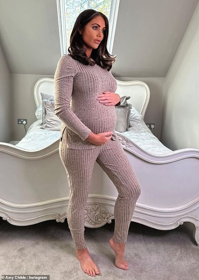La embarazada Amy Childs se frota la barriga mientras viste ropa deportiva de maternidad mientras comparte un video divertido mientras…