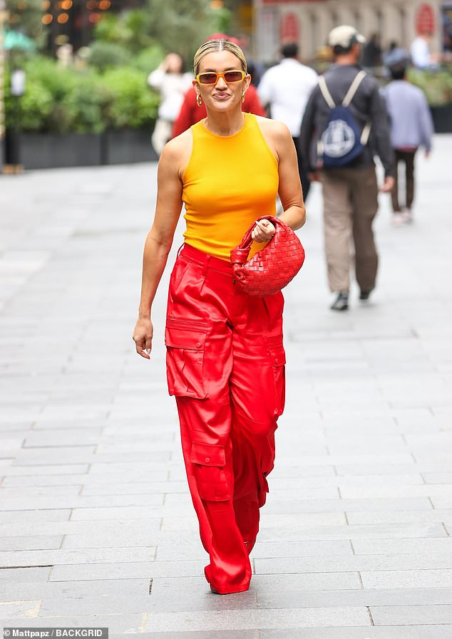 Superestilo yo! Ashley Roberts canaliza el logotipo de McDonald’s con un top amarillo y pantalones cargo de color rojo brillante…