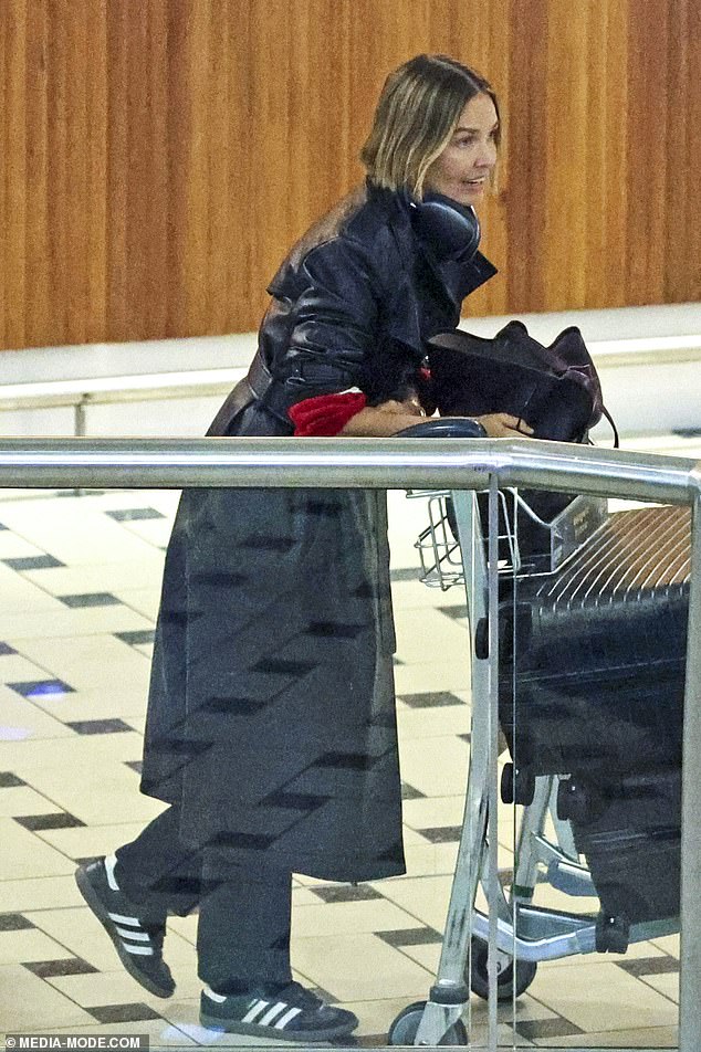 Lara Worthington hace una llegada a la moda al Aeropuerto Internacional de Brisbane vestida con una gabardina de cuero estilo…