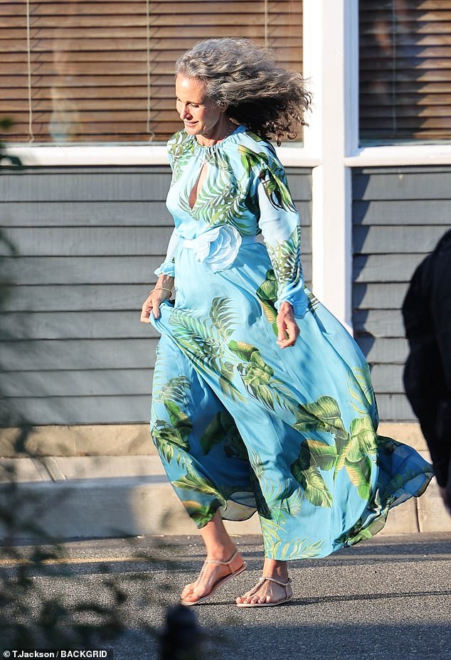 Andie MacDowell, de 65 años, se ve elegante con un vestido fluido con estampado azul y verde para la boda…
