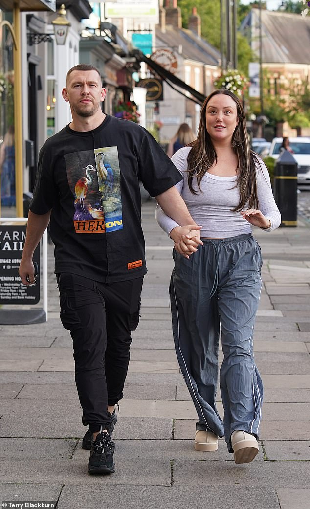 Charlotte Crosby luce una figura informal con una sudadera con capucha y calzas mientras pasea del brazo con su novio…
