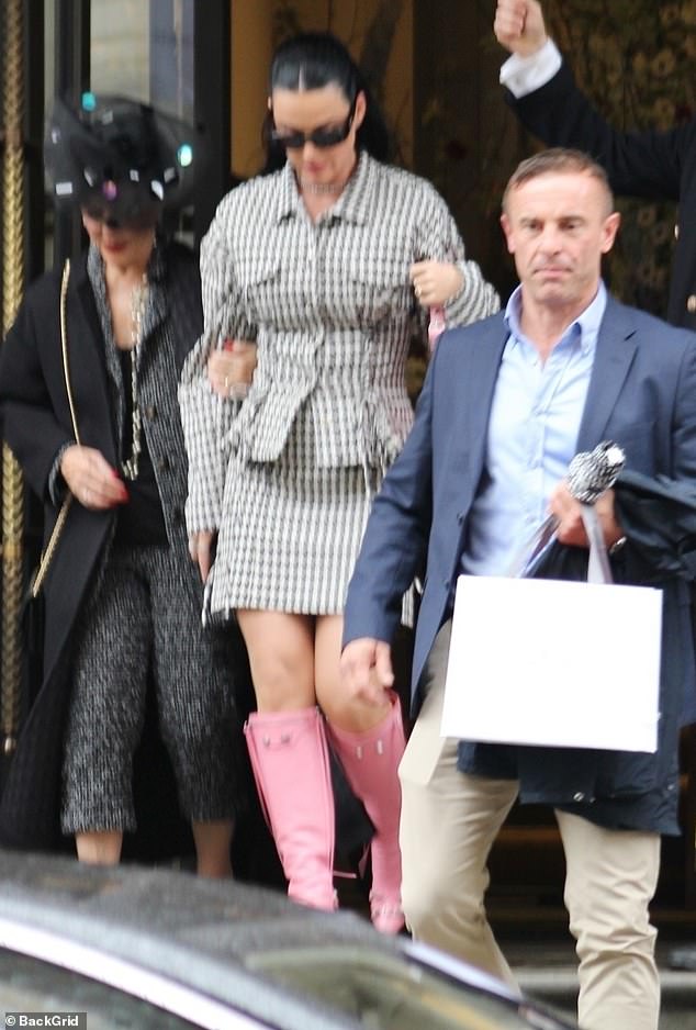 Katy Perry muestra su estilo único con un traje de falda de pata de gallo y botas rosas cuando sale…