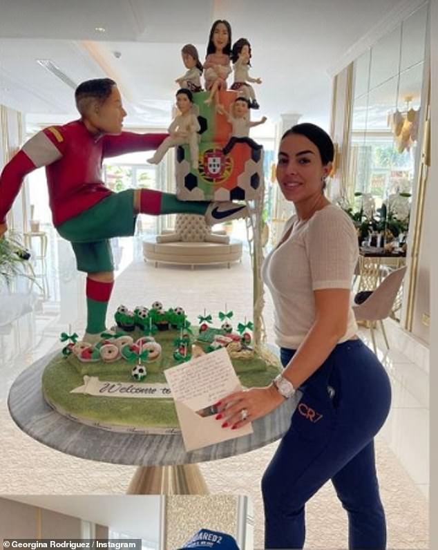 Georgina Rodríguez posa con una réplica gigante de su pareja Cristiano Ronaldo cuando aterriza en Doha con sus hijos para…
