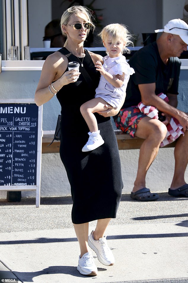 La licenciada Anna Heinrich le enseña a su hija Elle de dos años a caminar mientras la pareja disfruta de…