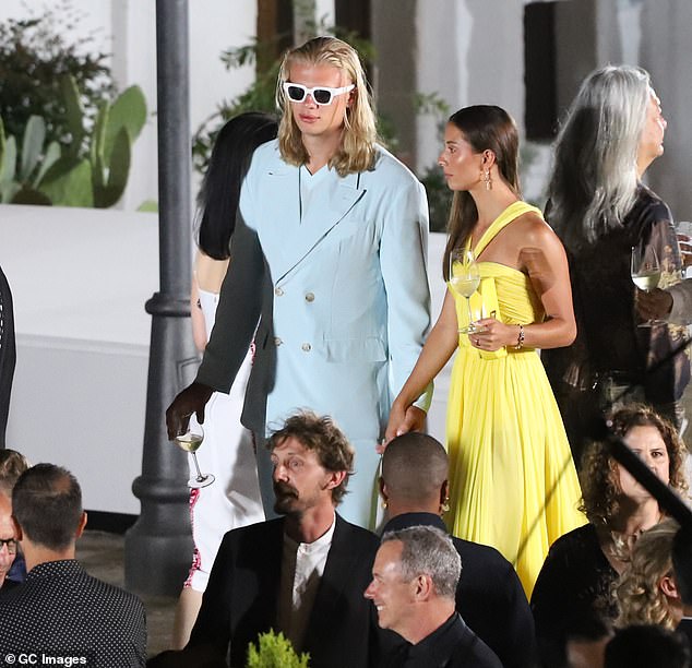 El descamisado Erling Haaland recibe ayuda con su trenza de su novia en bikini, Isabel Johansen, a bordo de un…
