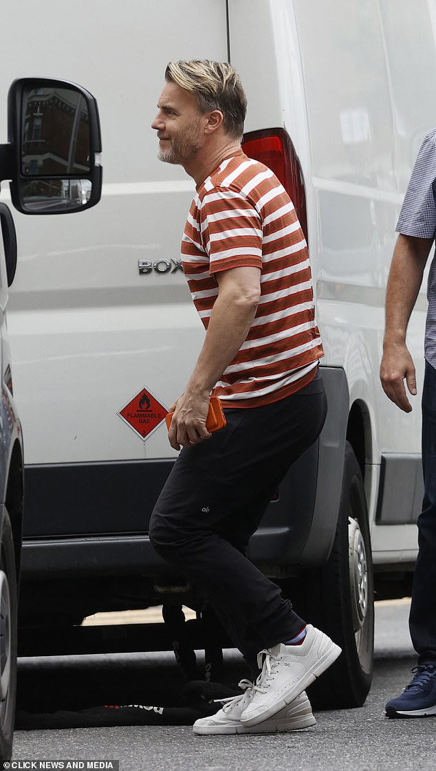 Take That’s Gary Barlow, Howard Donald y Mark Owen fueron vistos en el set el viernes mientras filmaban en el…
