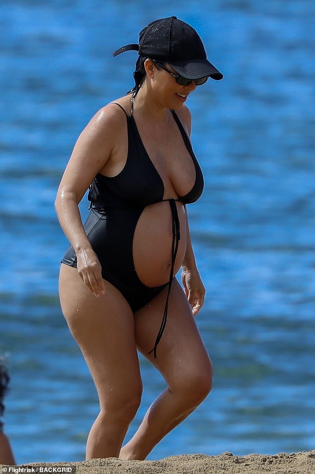 ¡Peek-a-bump! Kourtney Kardashian muestra su vientre de embarazo al revelar un monokini negro, mientras disfruta de otro día de playa…