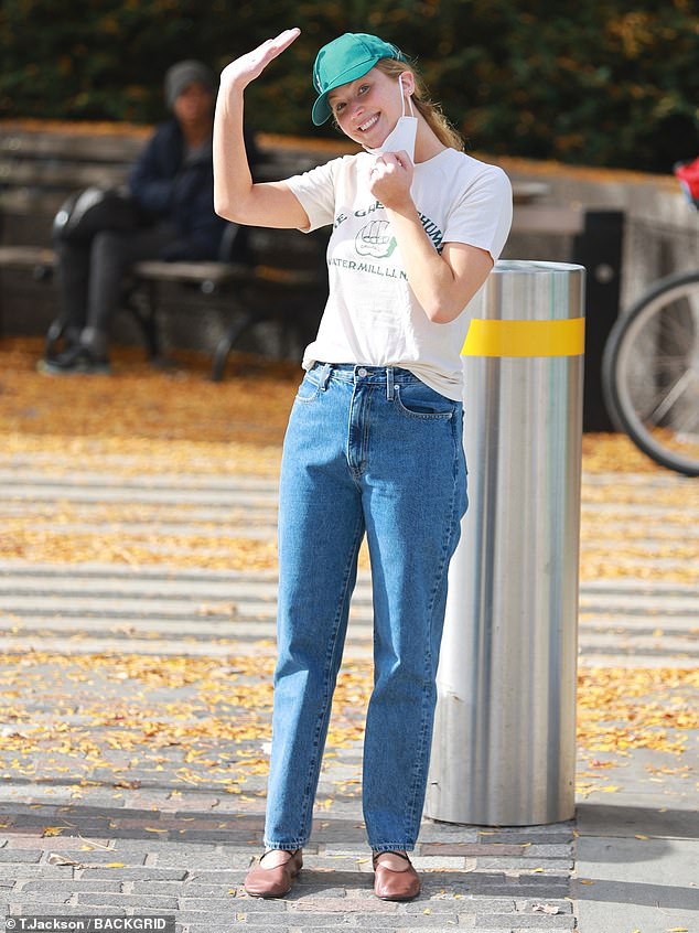 Jennifer Lawrence muestra su sonrisa ganadora mientras la mantiene informal con jeans y una camiseta mientras da un paseo con…