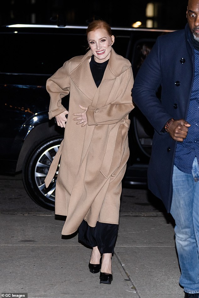 Jessica Chastain tiene una figura elegante con un vestido negro y tacones y se envuelve en un elegante abrigo camel…