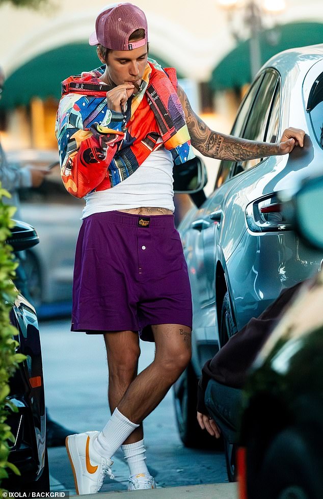 Justin Bieber muestra un brazo tatuado con su sudadera con capucha tirada hasta la mitad de su hombro mientras disfruta…