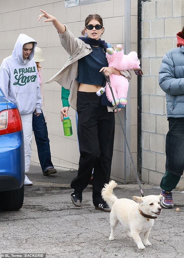 Kaia Gerber mostró una figura casual cuando salió de un restaurante con su perro, Milo, en Los Feliz después de…