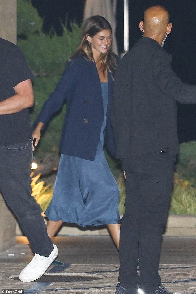 Kaia Gerber muestra sus piernas tonificadas con un vestido azul marino satinado cuando se une a su novio Austin Butler…