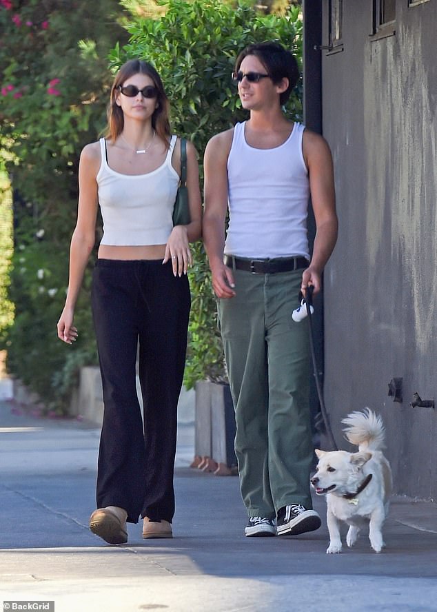 Kaia Gerber muestra su vientre esbelto en una camiseta sin mangas recortada mientras se mantiene fresca con una bebida helada…