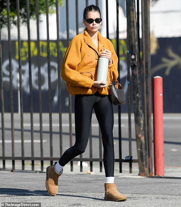 Kaia Gerber optó por la comodidad informal usando mallas ajustadas y una chaqueta colorida cuando salió para una breve salida…
