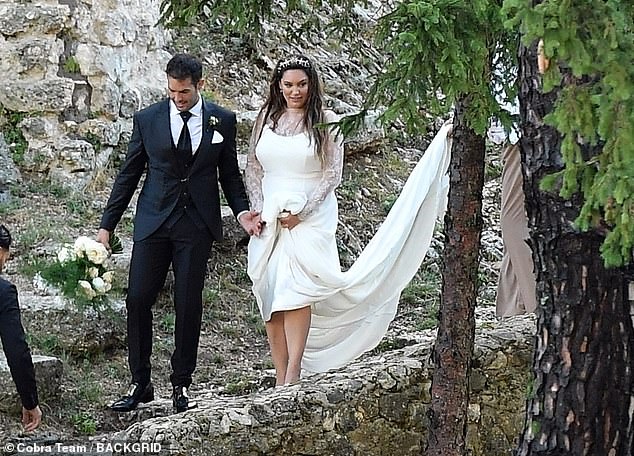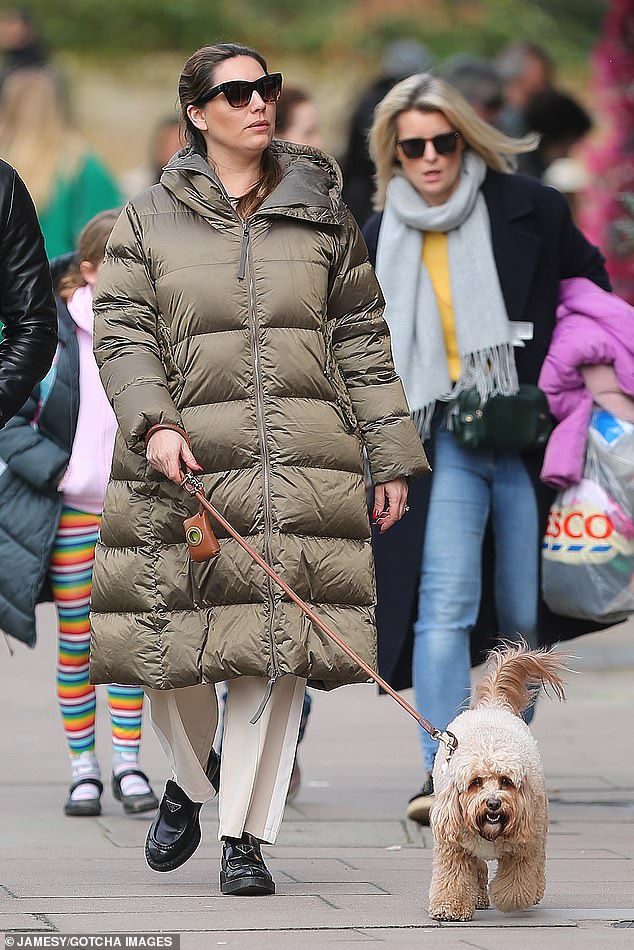 Kelly Brook se abriga con un abrigo acolchado mientras disfruta de un paseo con su esposo Jeremy Parisi y su…