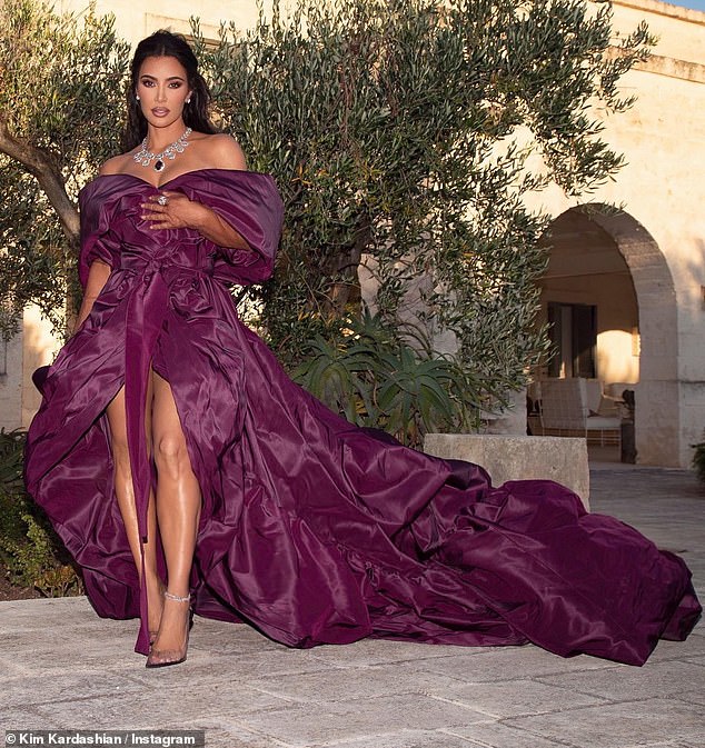 Kim Kardashian made quite the dramatic statement in a bellowing plum gown as she attended the Dolce & Gabbana Alta…