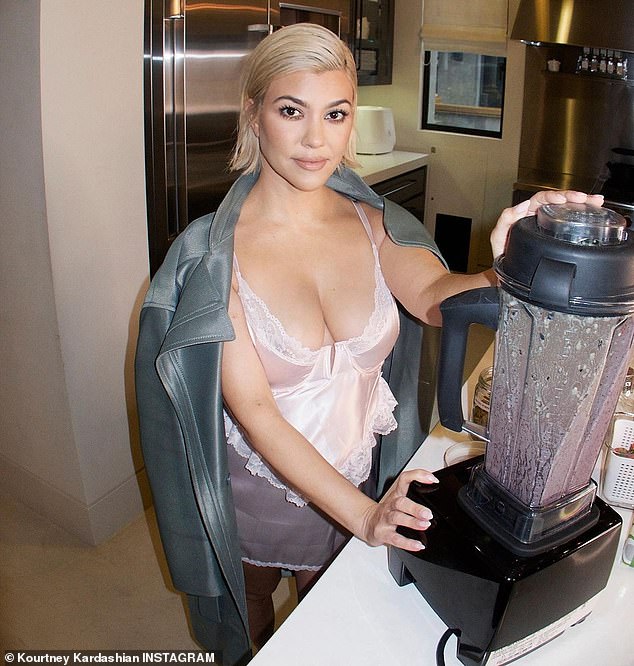 Kourtney Kardashian luce una exhibición tetona con una blusa de lencería rosa escotada mientras prepara un delicioso batido en una…