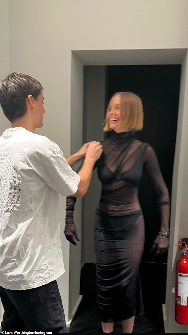 Lara Worthington muestra su esbelta figura con un atrevido vestido transparente y ropa interior negra mientras asiste a la Semana…