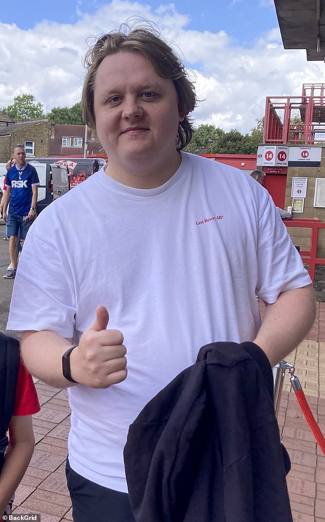 Lewis Capaldi se ve de buen humor y muestra un pulgar hacia arriba mientras asiste al partido de fútbol de…