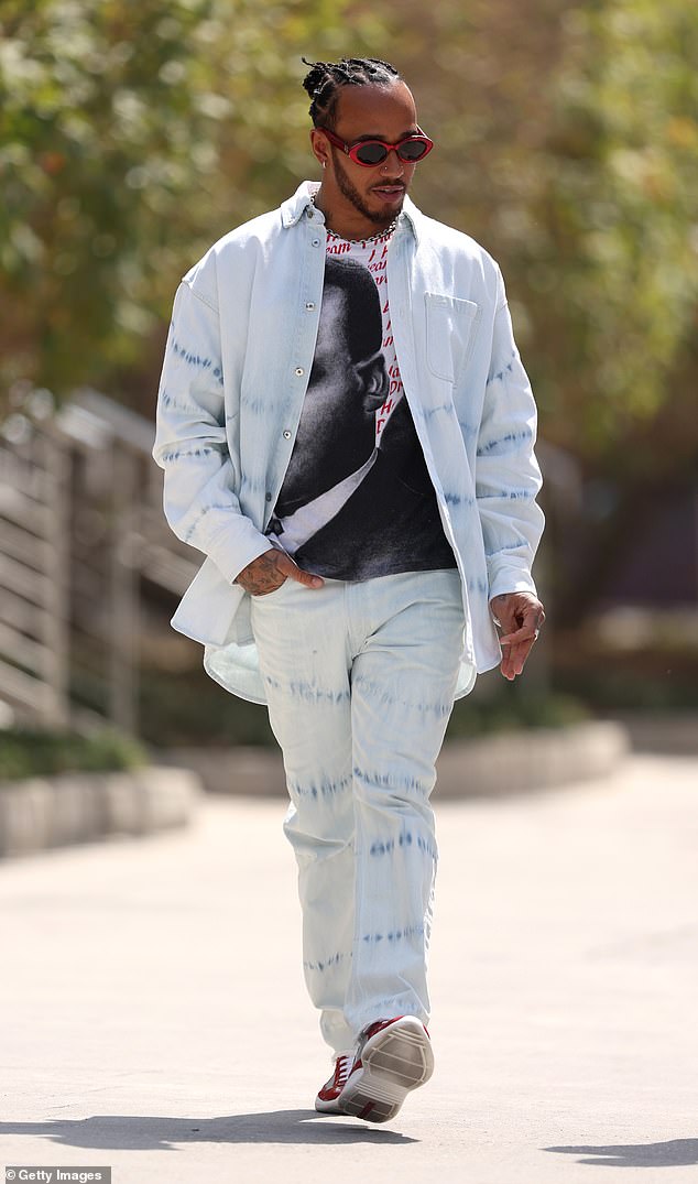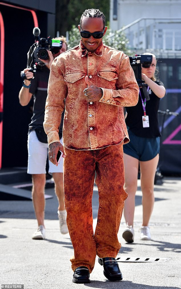 Lewis Hamilton muestra su sentido único del estilo con un conjunto de mezclilla naranja descolorido cuando llega al Gran Premio…