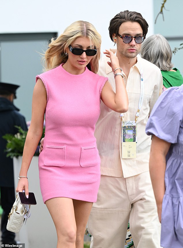 La novia de Liam Payne, Kate Cassidy, luce una exhibición de piernas largas con una minifalda color crema mientras disfrutan…