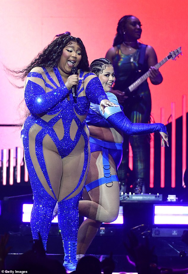Lizzo presenta una actuación típicamente enérgica mientras hace una declaración de estilo en un catsuit azul adornado con diamantes de…