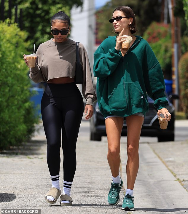 Hailey Bieber mostró sus largas piernas en diminutos pantalones cortos de gimnasia mientras estaba acompañada por su amiga cercana, Lori…