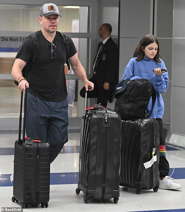 Matt Damon se mantiene casual con una camiseta y jeans mientras lo acompañan su esposa e hijas mientras camina por…