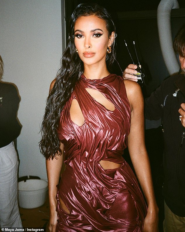 Maya Jama muestra su figura tonificada con un vestido de satén rojo con recortes atrevidos en tomas detrás de escena…