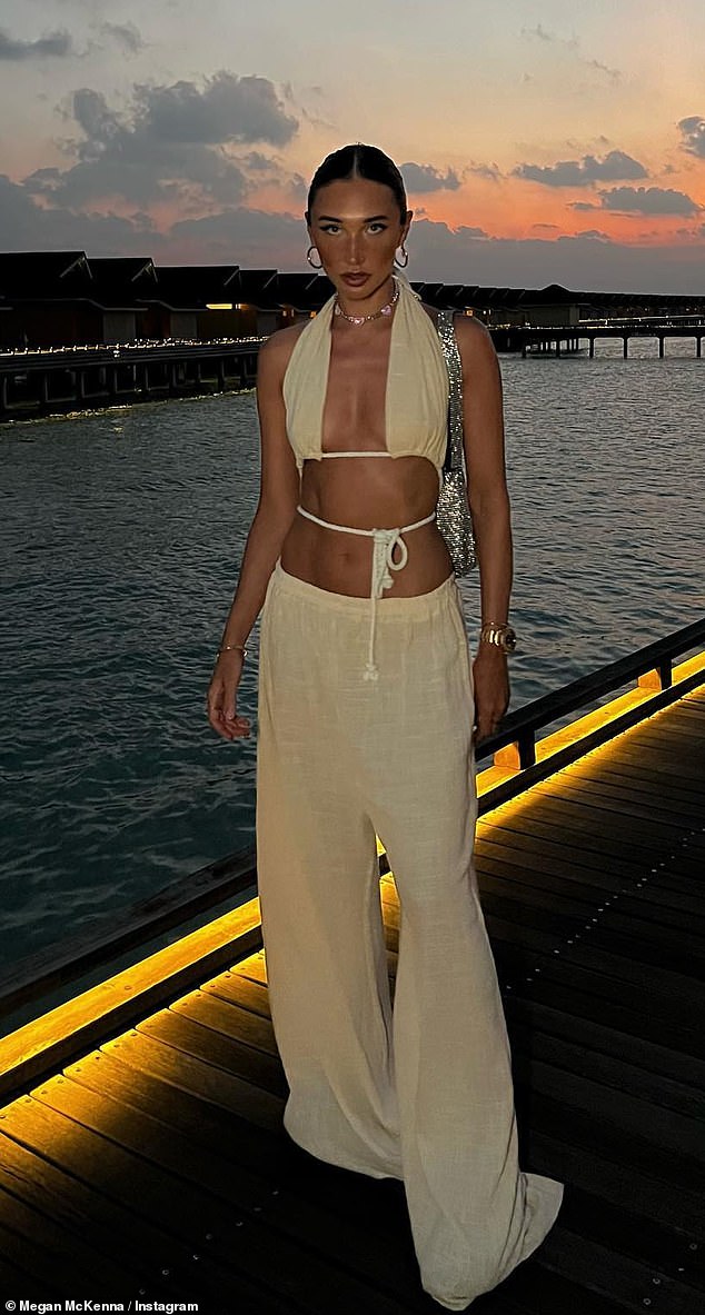 Megan McKenna muestra su torso tenso mientras se pone pantalones de lino de cintura baja con un top corto de…