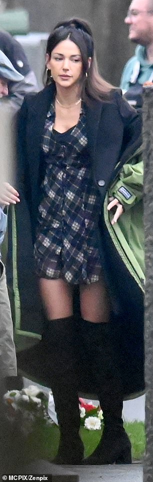 Michelle Keegan luce una figura elegante con un minivestido de cuadros escoceses y botas hasta los muslos mientras filma escenas…