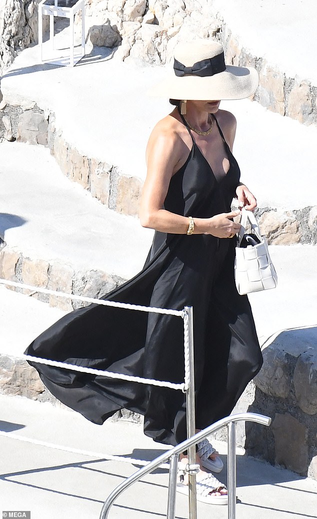 Catherine Zeta-Jones, de 53 años, luce una figura elegante con un vestido largo negro pronunciado y un sombrero de ala…