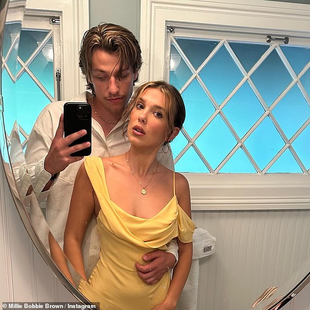 Millie Bobby Brown deslumbra con un elegante vestido amarillo mientras publica una extraña selfie con su prometido Jake BongioviPor Niomi…