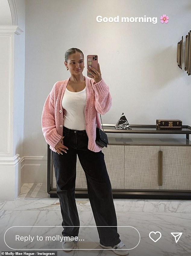 Molly-Mae Hague se ve hermosa cuando se pone un cárdigan de punto rosa para llevar a su hija Bambi a…