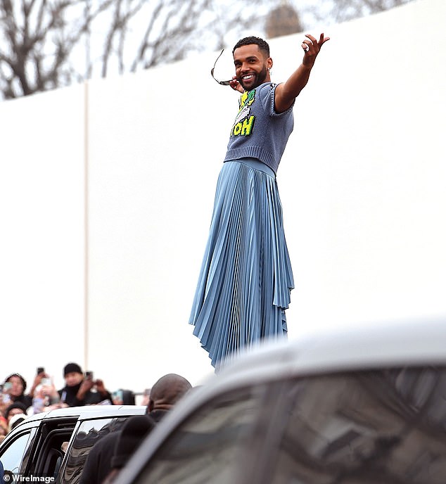 Lucien Laviscount hace una gran entrada en la Semana de la Moda de París mientras modela una falda plisada azul…