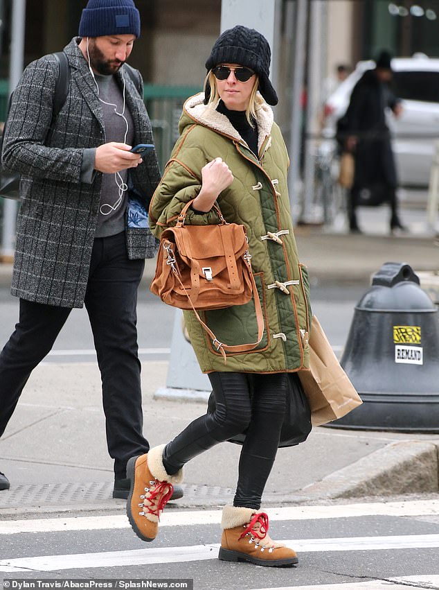 Nicky Hilton se abriga con un abrigo forrado de piel mientras sale de una tienda de comestibles en el vecindario…