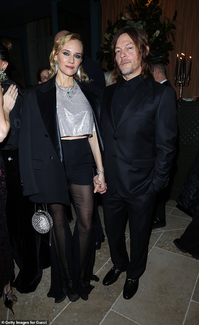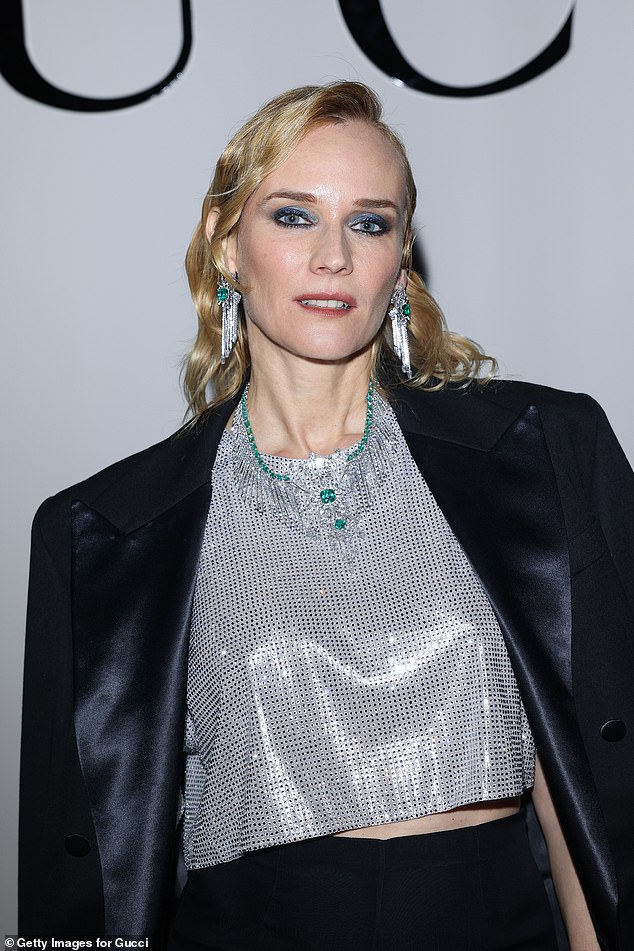 Diane Kruger deslumbra con un top corto plateado y una falda negra mientras hace una rara aparición pública con su…