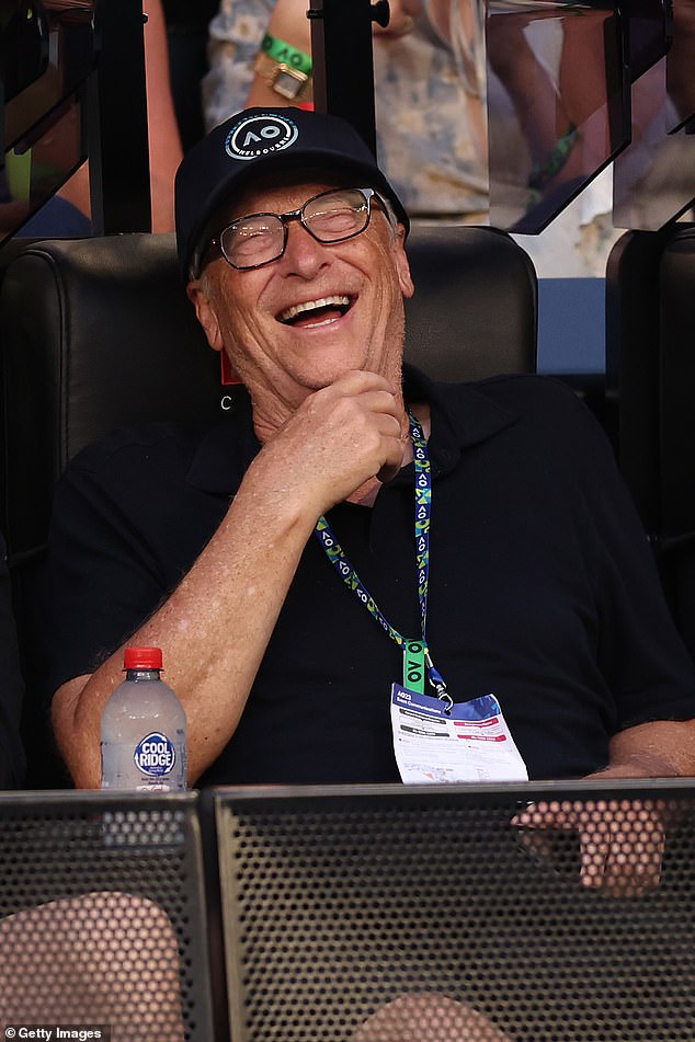 El multimillonario Bill Gates tiene una figura informal y se mezcla con la multitud mientras ve un partido de tenis…