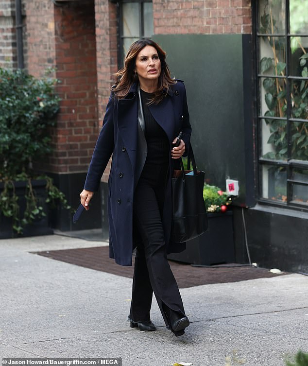 Mariska Hargitay va en serio con una gabardina azul medianoche mientras filma escenas para Law & Order SVU en Nueva…