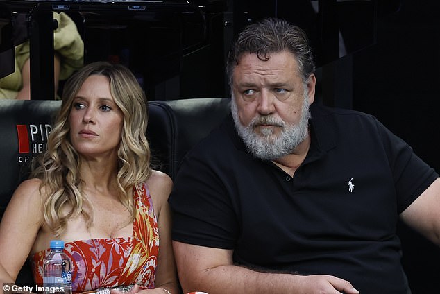 Russell Crowe se relaja con un polo y jeans mientras su novia Britney Theriot presenta una exhibición animada en la…