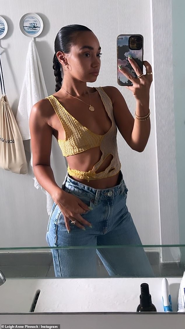 Leigh-Anne Pinnock exhibe su abdomen tonificado en un top corto amarillo con recortes desgastados mientras comparte una selfie en el…