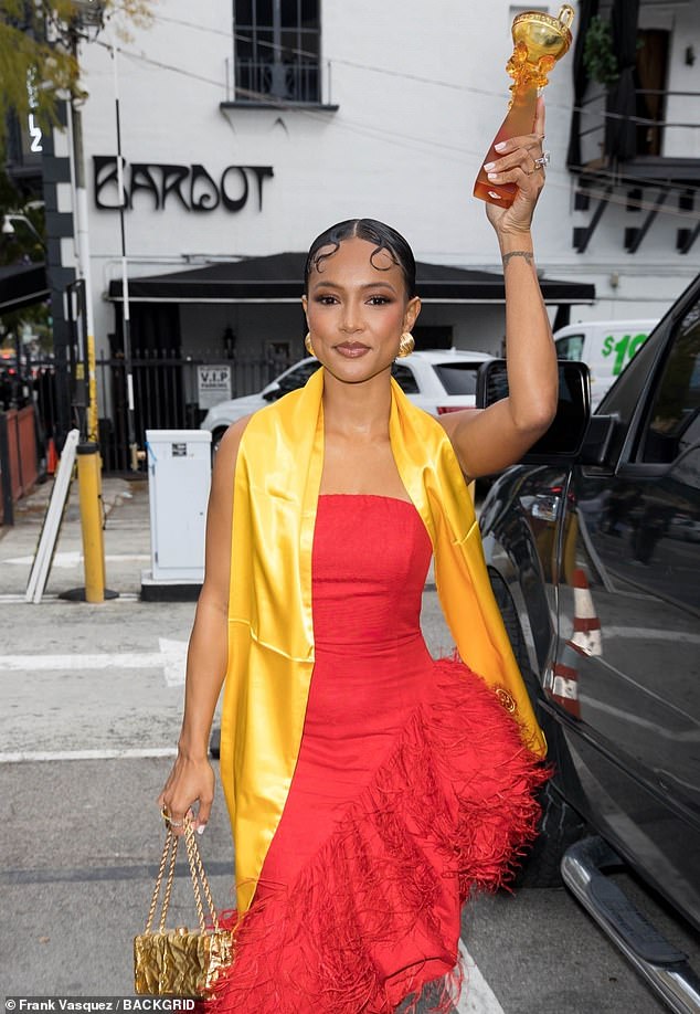 Karrueche Tran orgullosamente sostiene su trofeo mientras sale con un vestido rojo de la ceremonia de los Premios Huading de…