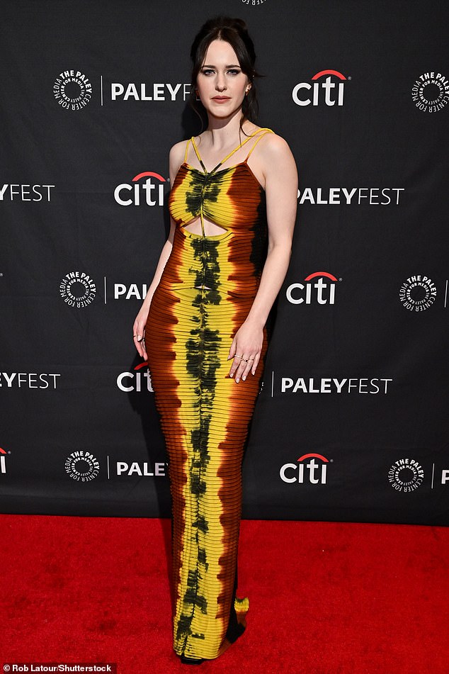 Rachel Brosnahan luce un vestido recortado bastante colorido mientras llega a la alfombra roja de PaleyFest para promocionar la quinta…