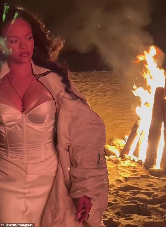 Rihanna luce tetona con un vestido blanco escotado mientras habla con su director en la playa en imágenes detrás de…