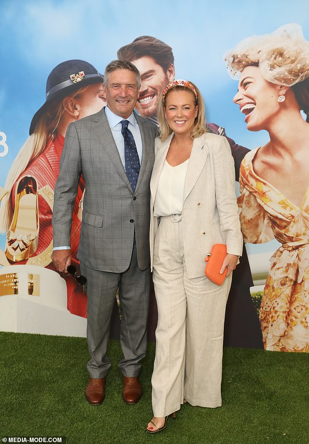 Samantha Armytage se ve elegante con un traje de pantalón beige y se acerca a su esposo Richard Lavender mientras…
